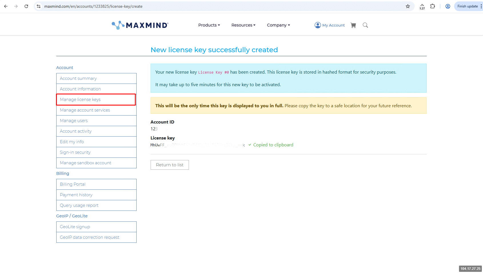 Lưu lại Account ID và License Key (cần để tải cơ sở dữ liệu GeoIP).
