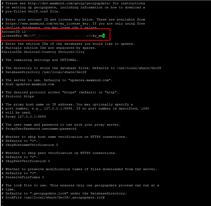 Bạn thực hiệ mở file cấu hình /etc/GeoIP.conf. Và cập nhật các thông tin sau đã tạo ở mục 1.