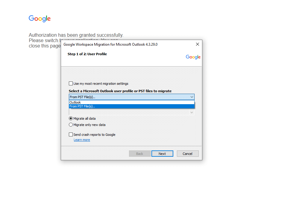 Sau khi cấp quyền thành công, 1 hộp thoại cho bạn tải file .pst của mình lên để bắt đầu Migrate dữ liệu
