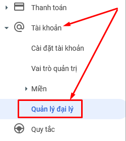 – Tại giao diện quản trị, điều hướng đến Tài khoản -> Quản lý đại lý để bắt đầu