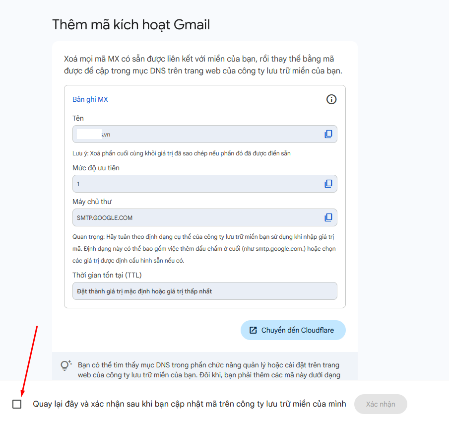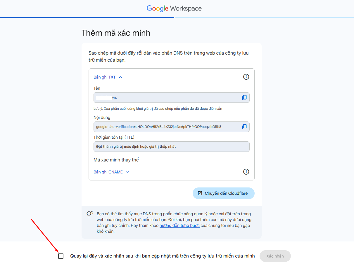 - Tiến hành verify tên miền mới được thêm vào. Sau khi add TXT xong, bạn quay lại và tick chọn vào ô ” Quay lại đây và xác nhận sau khi bạn cập nhật mã trên công ty lưu trữ miền của mình”