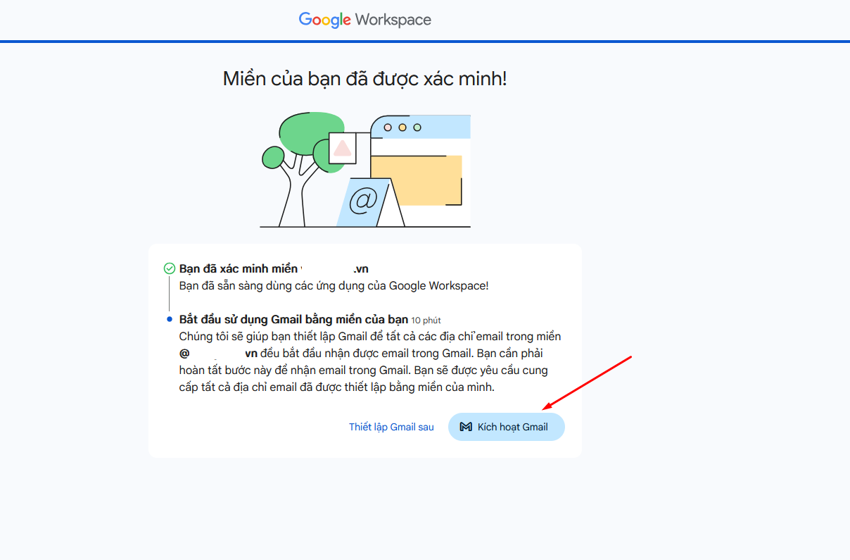 - Tên miền sau khi được verify thành công, bạn tiến hành ” Kích hoạt Gmail” để có thể gửi/nhận mail trên tên miền mới.