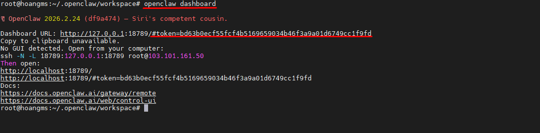 Sau khi chạy lệnh openclaw dashboard trên máy chủ, hệ thống sẽ hiển thị một đường dẫn truy cập Dashboard. Ví dụ: