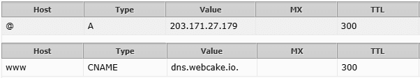 Vào phần quản trị tên miền tại Nhân Hòa và cấu hình 2 bản ghi dưới đây để điều hướng trỏ về webcake: