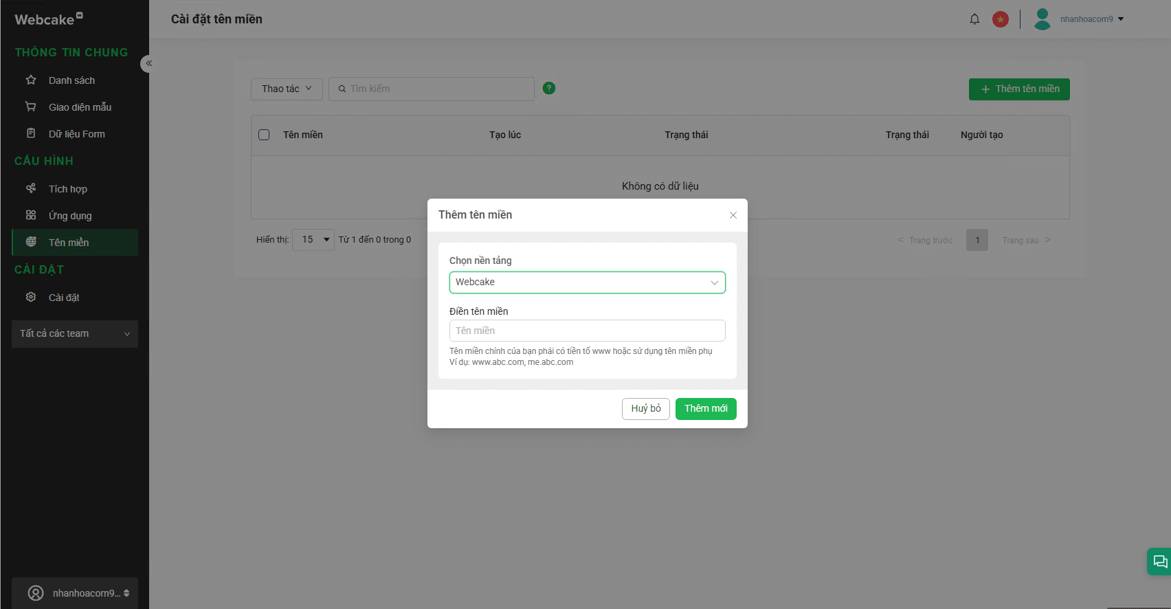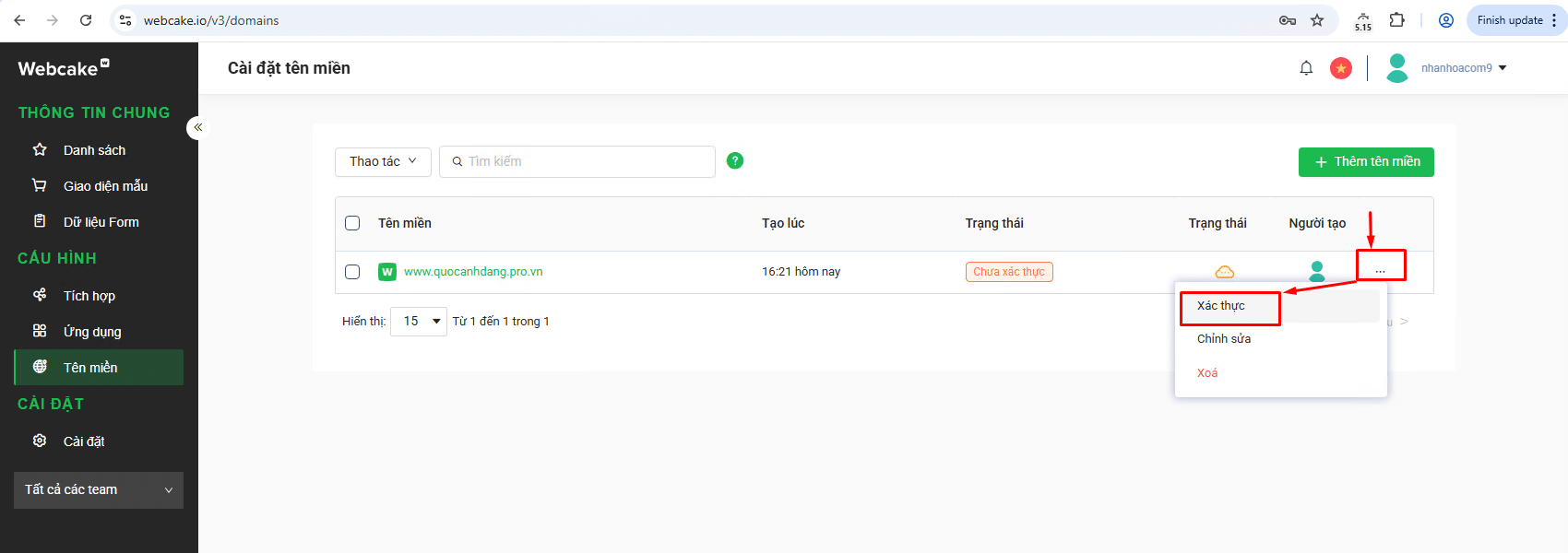 Tiếp theo bạn truy cập Dashboard Webcake -> Tên miền: https://webcake.io/v3/domains. Thực hiện thêm tên miền bạn cần xác thực sau khi trỏ về Webcake theo các bước hướng dẫn trên màn hình.