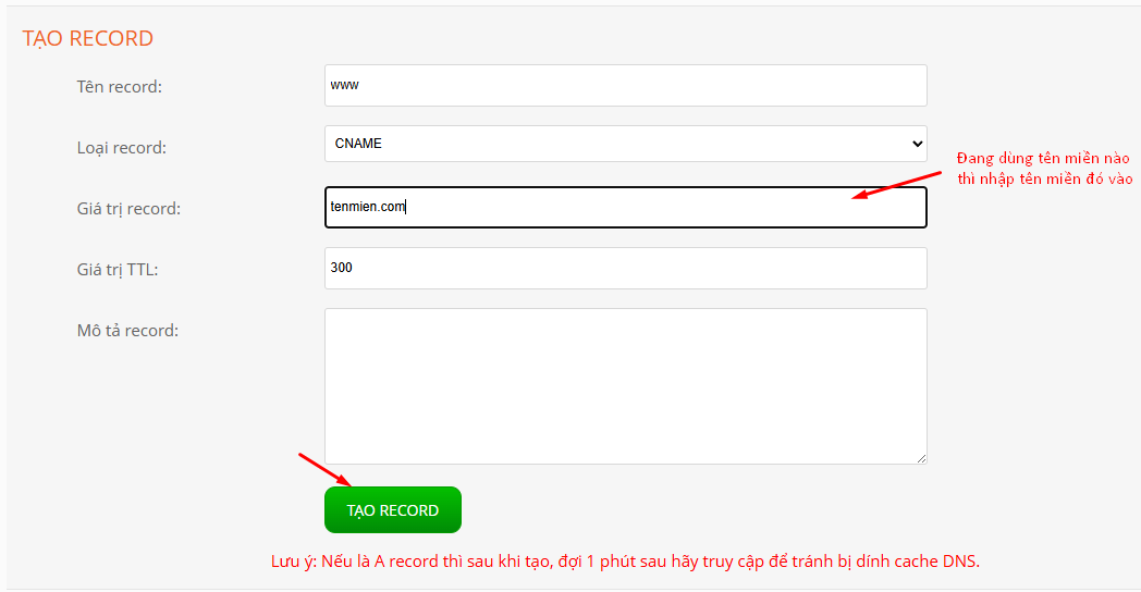 Value (Giá trị record): nhập tên miền (ví dụ: tenmien.com)