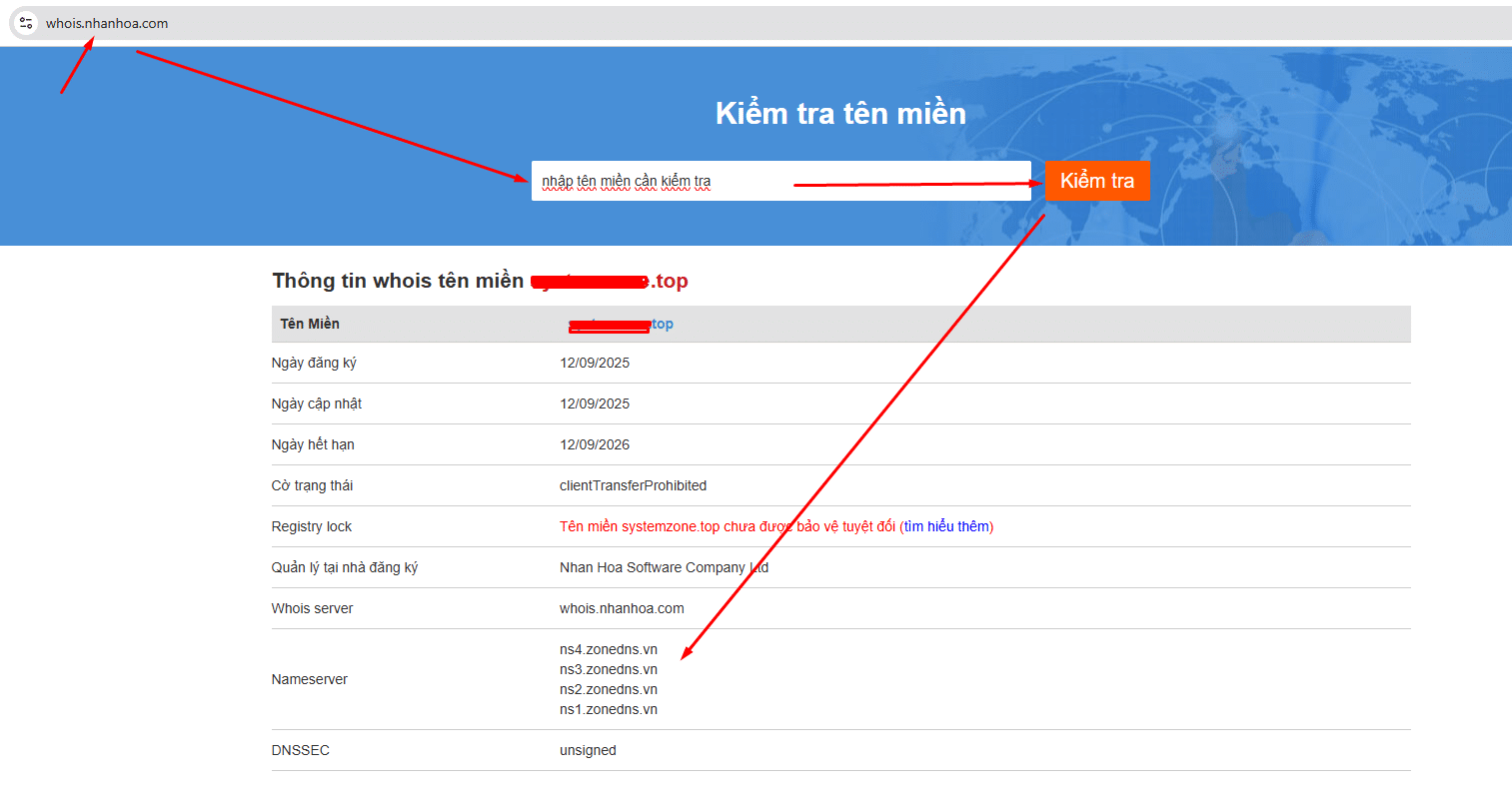 Truy cập trang whois.nhanhoa.com > nhập <tên miền>  > Kiểm tra