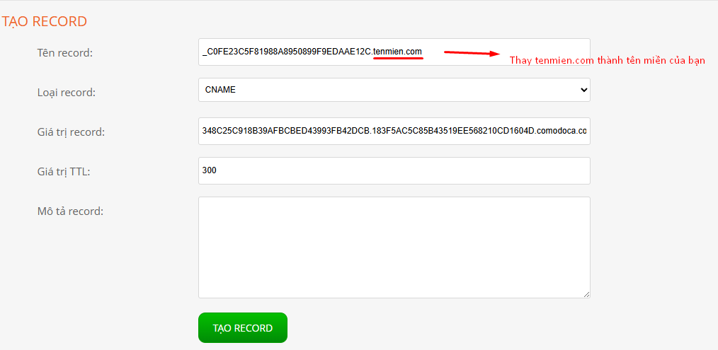 Phần Tên record tùy theo nhà cung cấp sẽ trỏ Full hoặc sẽ bỏ domain phía sau: