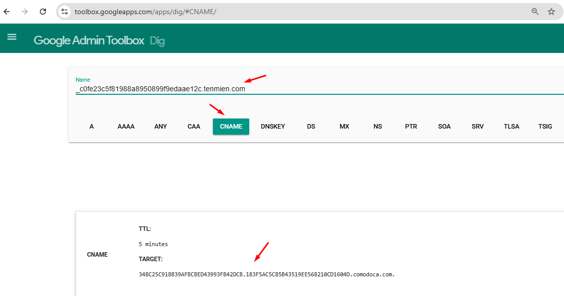 Quý khách có thể check online xem bản ghi CNAME đã nhận chưa tại đây, nếu hiện được giá trị là đã trỏ thành công: https://toolbox.googleapps.com/apps/dig/#CNAME/