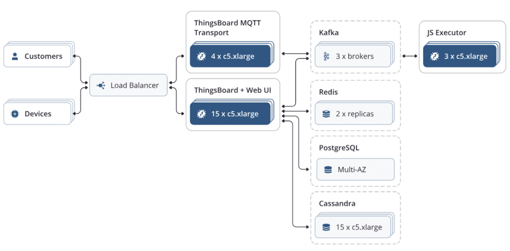 ThingsBoard hỗ trợ mở rộng ngang (horizontal scaling), cho phép tăng số node để xử lý tải CPU/RAM. Tuy nhiên, cần đặc biệt lưu ý số lượng data points được lưu trữ.