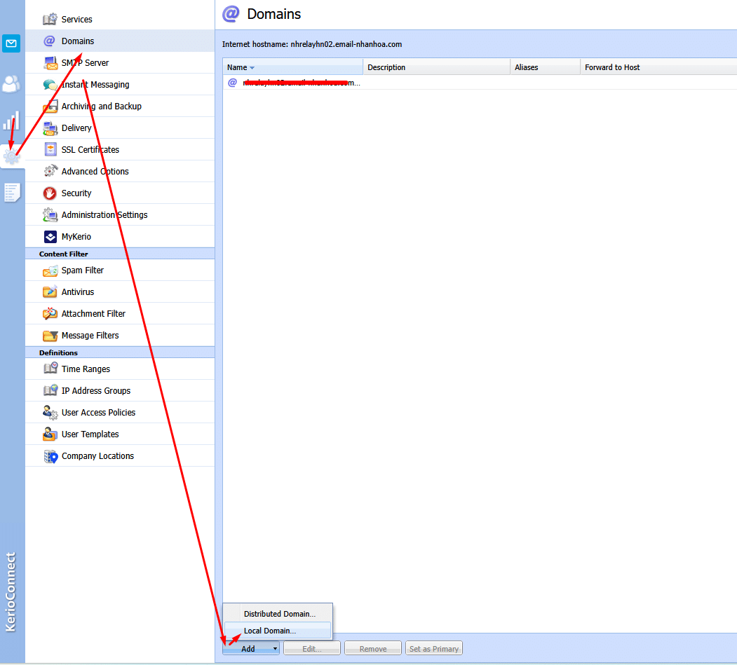 2. Chuyển đến Domain và nhấp vào Add > Local Domain